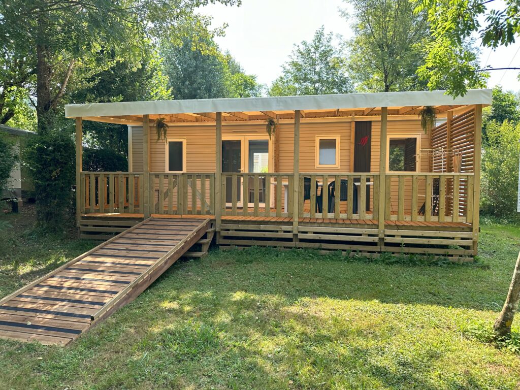 Nous n’avons pas de Mobil-Home adapté, pas encore. Nous avons mis une rampe à l’un de nos mobil-home, qui bénéficie d’une grande terrasse et d’un vaste espace à vivre. La double porte permet par ailleurs une entrée facile dans le mobil-home. Mais les portes de chambres, salle de bain et WC sont étroites. Le Mobil-Home est situé non loin du bloc sanitaire, qui est adapté comme nous l’avons vu précédemment.